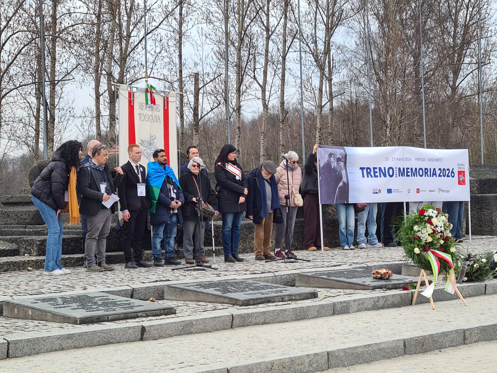 Ad aprire uno dei momenti simbolici più attesi del viaggio – iniziato lunedì 23 marzo, con la partenza del Treno dalla stazione di Firenze Santa Maria Novella – la deposizione della corona d’alloro al monumento internazionale che ricorda, con 23 lapidi in altrettante lingue (quelle di tutti i deportati), coloro a cui è stata strappata la vita a Birkenau. A compiere il gesto l’assessora all'istruzione e cultura della Memoria Alessandra Nardini.