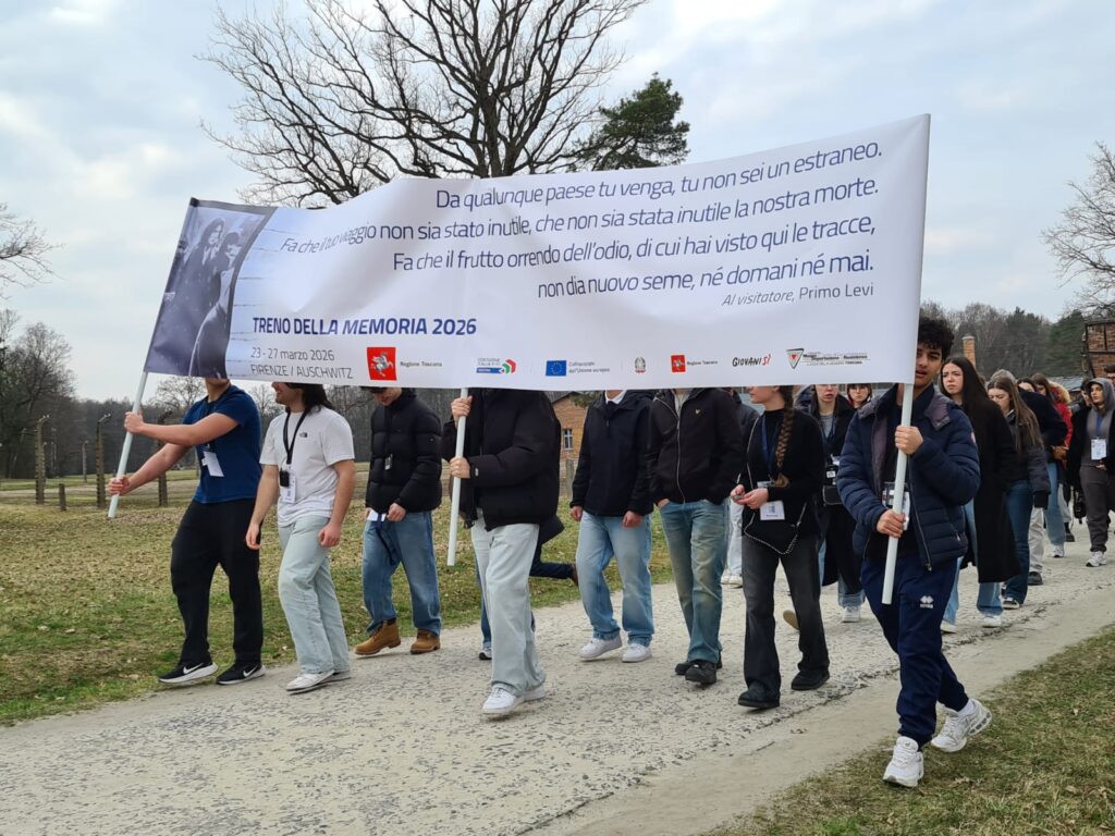 Una fiumana di studentesse e studenti toscani ha percorso ieri, 24 marzo, silenziosa e commossa il viale alberato nel campo di sterminio Birkenau che da quel che resta dei forni crematori porta al momumento alla memoria delle vittime. Il corteo del Treno della Memoria 2026, aperto dal gonfalone della Regione Toscana, con ragazze e ragazzi delle scuole toscane, rappresentanti delle comunità deportate e associazioni antifasciste ha portato così un messaggio di vita e speranza in un luogo di morte. Con la delegazione toscana presenti anche Andra e Tatiana Bucci, che all’orrore di quel campo, vissuto allora sulla propria pelle di bambine, sono sopravvissute.