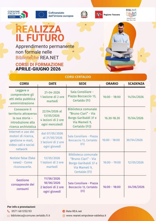 Per informazioni e iscrizioni è possibile contattare la Biblioteca comunale “B. Ciari” ai numeri 0571 661252 / 0571 661253 oppure scrivere all’indirizzo email biblioteca@comune.certaldo.fi.it