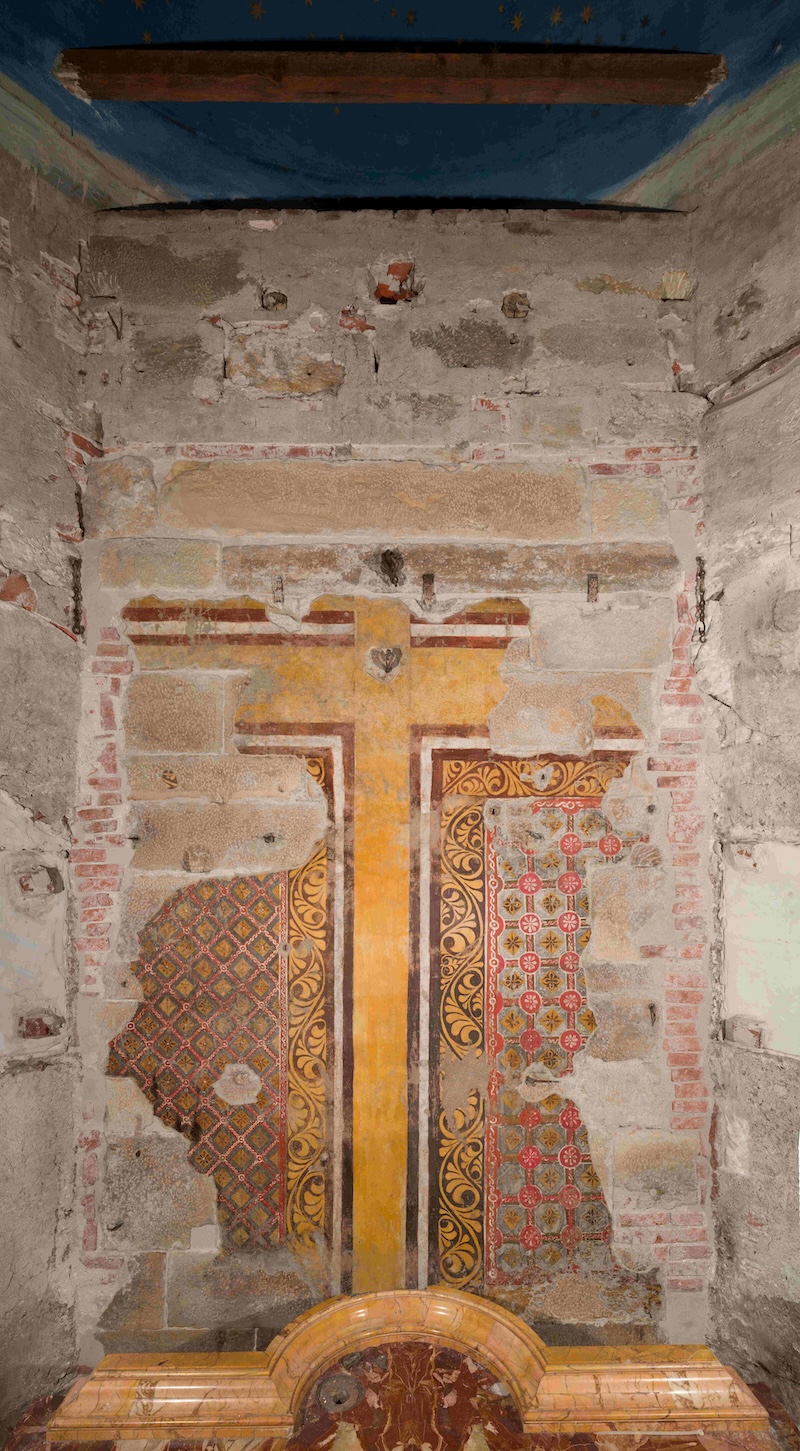 Liberata la parete di fondo sono, infatti, emersi i resti di una pittura murale, di cui non si conosceva l’esistenza, compromessa da un consistente deposito di polveri e materiali sedimentati. Grazie al restauro è adesso visibile una croce dipinta di colore ocra, realizzata ad affresco con finiture a secco, incorniciata da motivi vegetali di colore giallo-marroni e da una decorazione asimmetrica riconducibile a pattern tipici della produzione lucchese della seta nel Medioevo. Cronologicamente anteriore alla costruzione del tempietto del Civitali, la croce dipinta era concepita come fondale del Volto Santo e ha dimensioni compatibili con quella di legno del crocifisso.