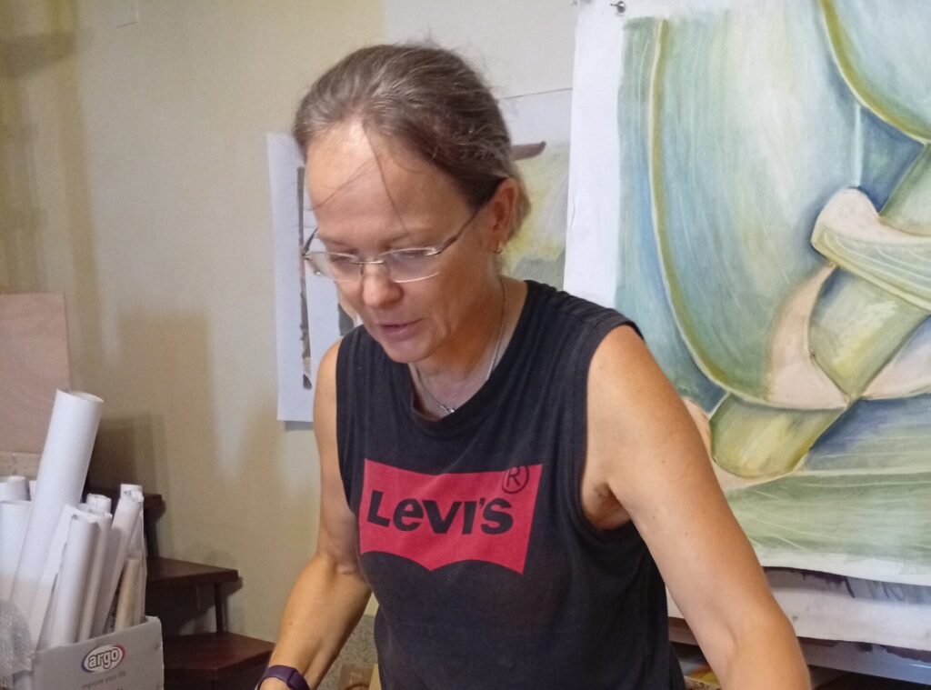 Lenka ha un bello studio, dove opera con i suoi attrezzi e con la sua ispirazione che, trattandosi di opere a fresco, la costringono a lunghe sedute di lavoro, dal mattino prestissimo fino a notte fonda. Il risultato è però straordinario, si modifica nel tempo. Del resto lei parla delle sue opere come fossero esseri viventi, ne studia le variazioni cromatiche, nel colore ma anche nella forma.