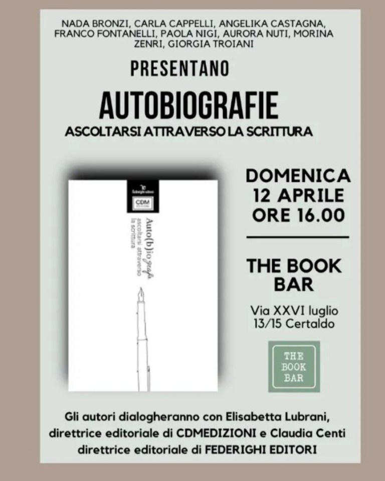 Presso il Book Bar di Certaldo, Elisabetta Lubrani e Claudia Centi presenteranno ufficialmente "Autobiografie. Ascoltarsi attraverso la scrittura"(2026). Il libro raccoglie i racconti degli otto allievi che hanno completato il percorso formativo 2026 (Nada Bronzi, Carla Cappelli, Angelika Castagna, Franco Fontanelli, Paola Nigi, Aurora Nuti, Morina Zenri, Giorgia Troiani). L'incontro, moderato dalle stesse Lubrani e Centi, sarà l'occasione per scoprire come il metodo dell "ascolto attraverso la scrittura" sia diventato realtà editoriale.