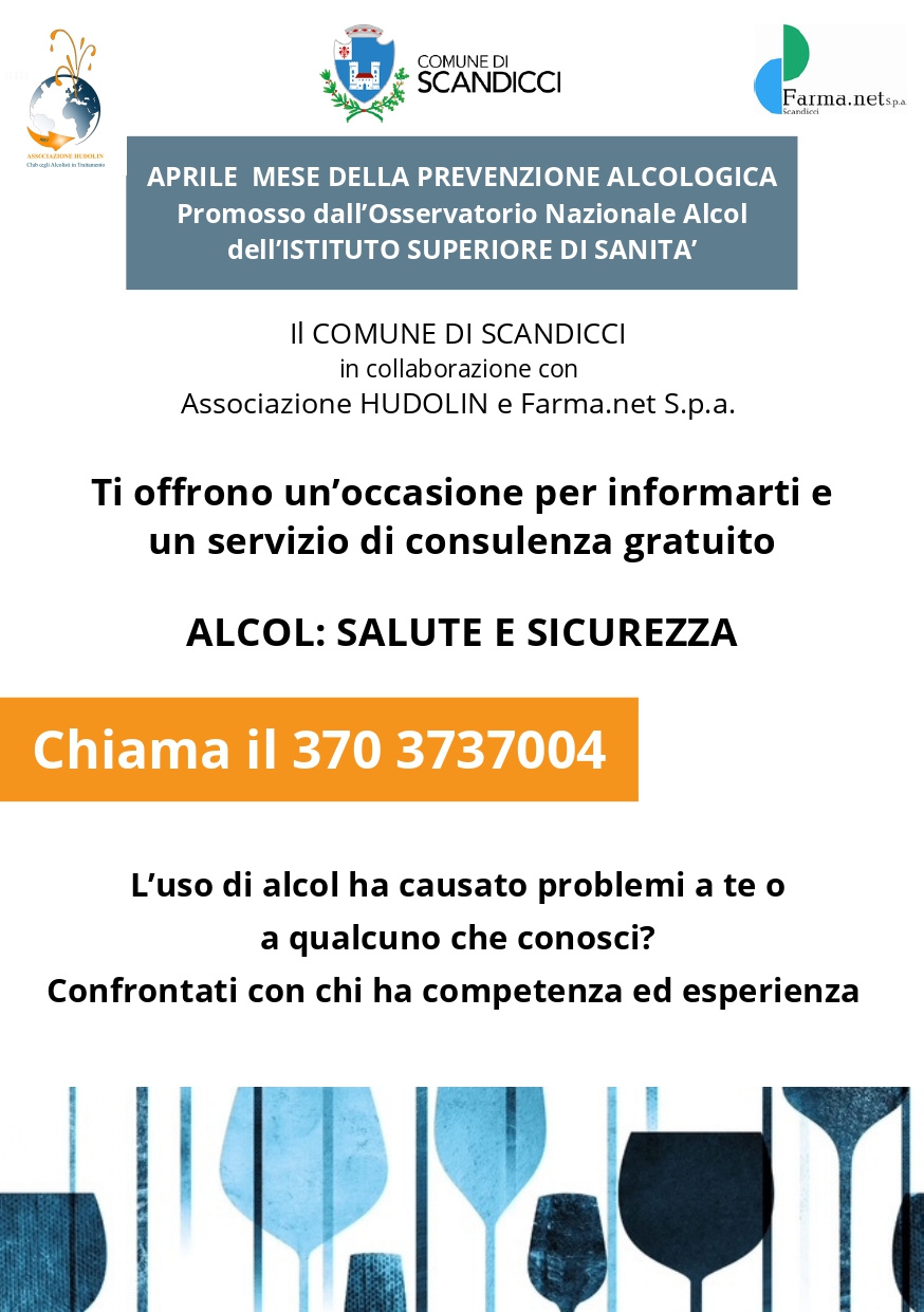In aprile, mese della prevenzione alcologica, in tutte le farmacie comunali di Scandicci saranno in distribuzione volantini con un numero da chiamare per avere informazioni e supporto sui problemi relativi all'uso di alcol. Chiamando il 370 3737004 sarà possibile avere una consulenza psicologica gratuita, per telefono o di persona, grazie agli esperti dell'Associazione Hudolin (per informazioni è anche possibile visitare il sito www.infoalcol.it). Le stesse informazioni inoltre saranno proiettate sui monitor delle farmacie. I volantini saranno disponibili anche al Punto Comune in piazzale della Resistenza.