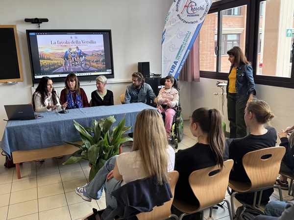 La bici come strumento di libertà,trampolino per scoprire il mondo grazie a due genitori che non si sono mai persi d'animo e che non hanno mai smesso - è proprio il caso di dirlo – di pedalare: Giovanni e Silvia sono i genitori di Emilia, una ragazza di Santa Croce sull'Arno che stamani ha incontrato gli studenti dell'istituto superiore Arturo Checchi (tre classi terze e tre classi quarte del liceo scientifico e del liceo sportivo, tra cui la 4^A dello scientifico frequentata proprio da Emilia) in quanto protagonista di quella che è stata ribattezzata “la favola della Versilia”. Emilia, nonostante una grave patologia, riesce a scoprire il mondo in bicicletta, sfruttando un modello particolare che è di fatto un sidecar senza motore spinto dalle gambe del papà, grande appassionato di bici. E che dall'anno scorso vede l'aiuto anche della madre Silvia, che ha deciso di pedalare insieme a loro.