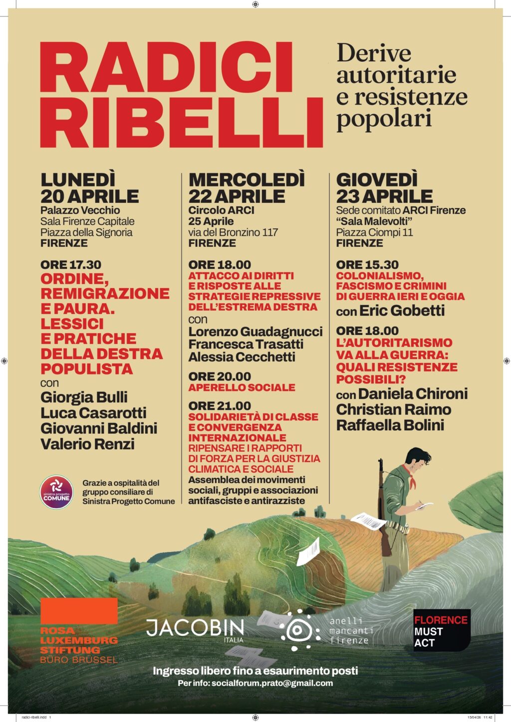 In vista della prossima Festa della Liberazione, con il supporto della Fondazione Rosa Luxemburg ed in collaborazione con JACOBIN Italia, si invita alla conferenza “Radici Ribelli, derive autoritarie e resistenze popolari”, che si terrà a Firenze il 20, 22 e 23 aprile, insieme ad altre realtà del territorio come Anelli Mancanti e Florence Must Act.