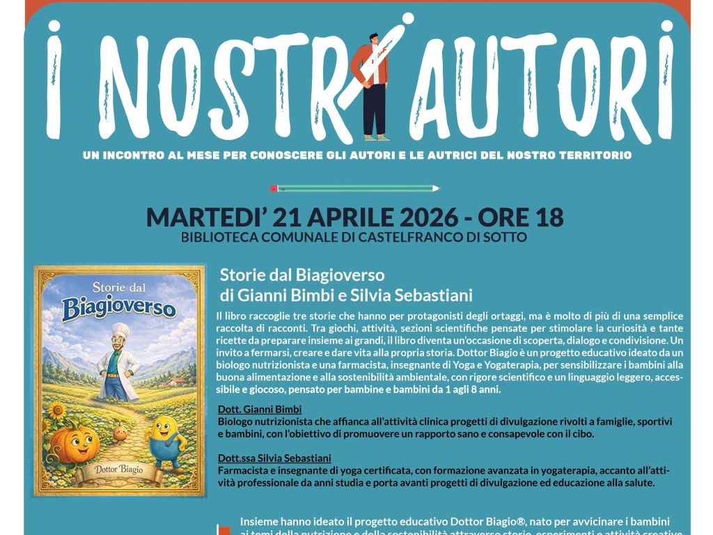 Un incontro rivolto ad un pubblico adulto, dedicato a genitori, educatori e insegnanti per riflettere sull’importanza dell’educazione alimentare nei primi anni di vita. Sarà presentato il libro nato all’interno del progetto educativo Dottor Biagio®, pensato per essere letto insieme ai bambini - dai 3 agli 8 anni - per avvicinarli ai temi della nutrizione e della sostenibilità ambientale.