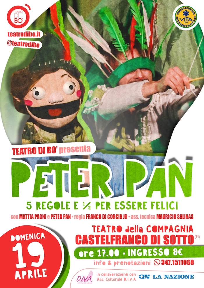 19 APRILE (ore 17.00): “Peter Pan: le 5 Regole e ½”. La produzione del Teatro di Bo’ con Mattia Pagni e Peter Pan (Spaghetti di Gelato) apre le danze portando grandi e piccini sull’Isola che non c’è, con la regia di Franco Di Corcia jr.