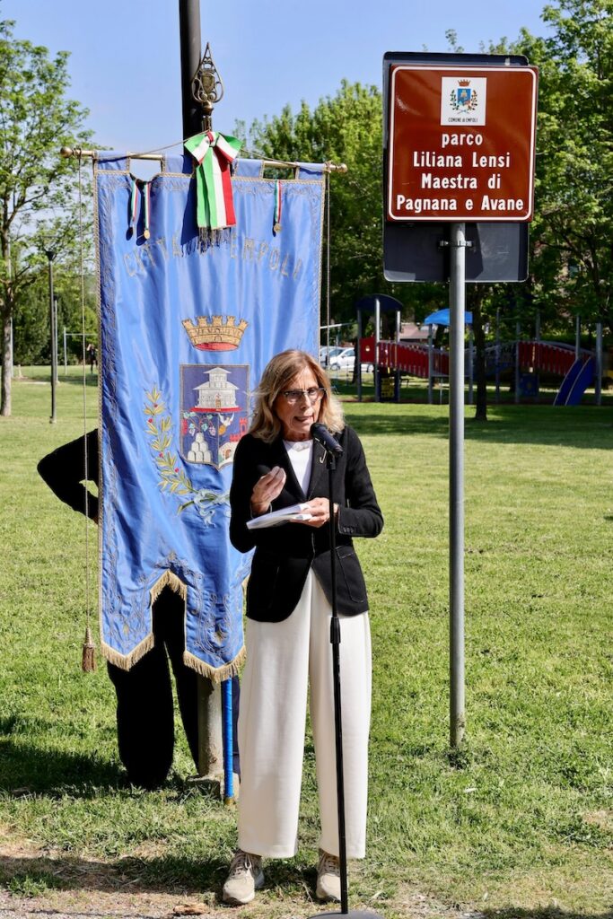 Una bella mattinata di sole e di emozioni. Questa mattina (sabato 18 aprile 2026) si è svolta la seconda intitolazione di un luogo pubblico, un’area a verde che porterà il nome di una indimenticata maestra: il parco di Liliana Lensi, Maestra di Pagnana e Avane.