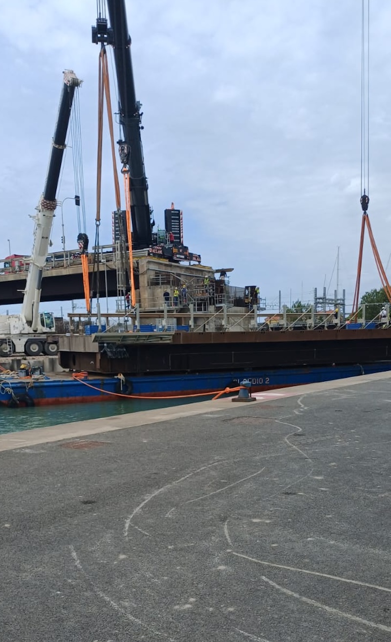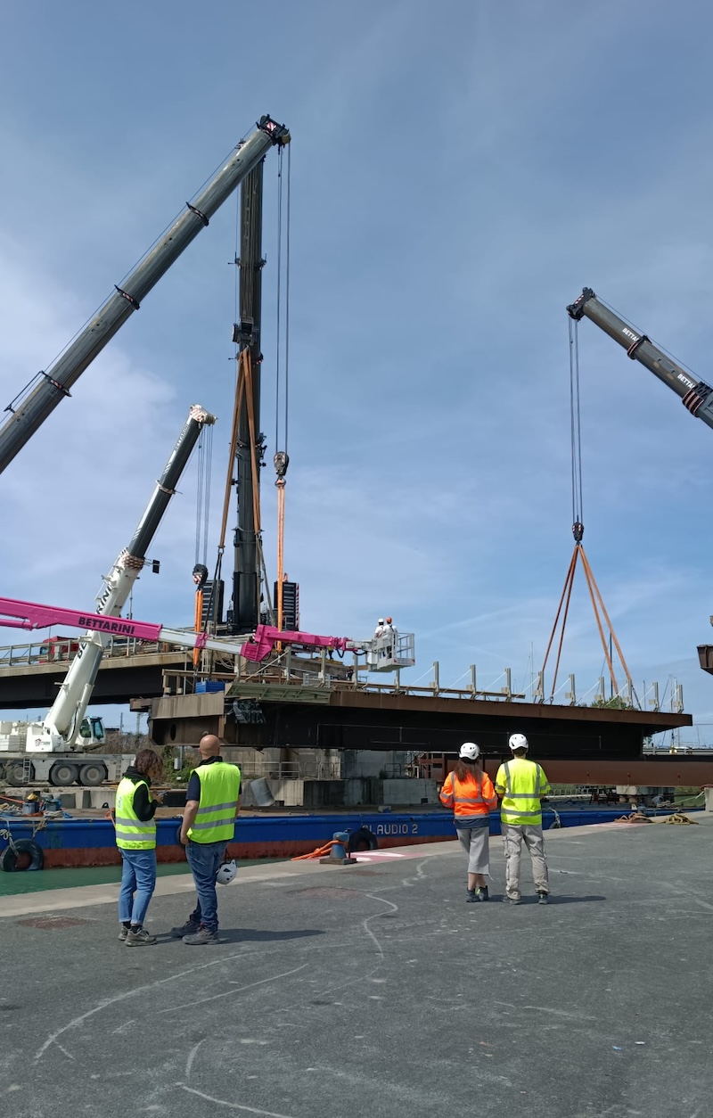 27–30 marzo (avvio lavori): scelta coraggiosa ma vincente — lavorare con l'impalcato a terra anziché in quota, per massimizzare la sicurezza degli operatori e accelerare i tempi. Il ponte è stato alleggerito, predisposte quattro gru, sollevato e adagiato su chiatta navale in banchina portuale.