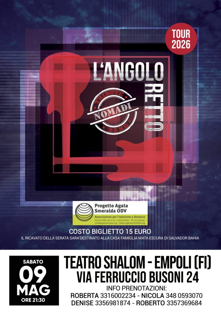 Sabato 9 maggio al teatro Shalom serata di beneficenza per il Progetto Agata Smeralda Odv. L' Angolo Retto, tribute band riconosciuta ufficialmente dai Nomadi, con le sue capacità musicali e comunicative, proporrà uno spettacolo coinvolgente , un vero e proprio viaggio musicale attraverso la storia del gruppo più longevo della musica pop-rock italiana