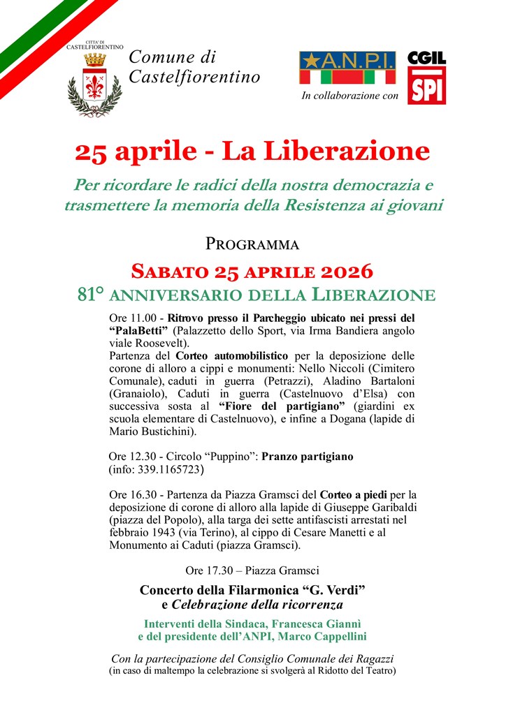 Castelfiorentino festeggia il 25 aprile, 81° Anniversario della Liberazione, con alcune novità. Il corteo automobilistico per la deposizione di alloro nelle frazioni sarà infatti per la prima volta al mattino, mentre la cerimonia e il corteo a piedi nel capoluogo si terranno come di consueto nel pomeriggio. Il ritrovo con le autorità civili e militari, le associazioni combattentistiche e della Resistenza è previsto alle ore 11.00 al Parcheggio di via Irma Bandiera, nei pressi del PalaBetti (Palazzetto dello Sport). Da qui il corteo automobilistico si dirigerà al Cimitero Comunale per la deposizione di una corona di alloro alla tomba di Nello Niccoli, per poi spostarsi a Petrazzi (Caduti in Guerra), quindi a Granaiolo (cippo di Aladino Bartaloni), e a Castelnuovo d’Elsa (Caduti in Guerra) con successiva sosta al “Fiore del partigiano” (giardini ex scuola elementare Castelnuovo), e infine a Dogana (lapide Mario Bustichini).