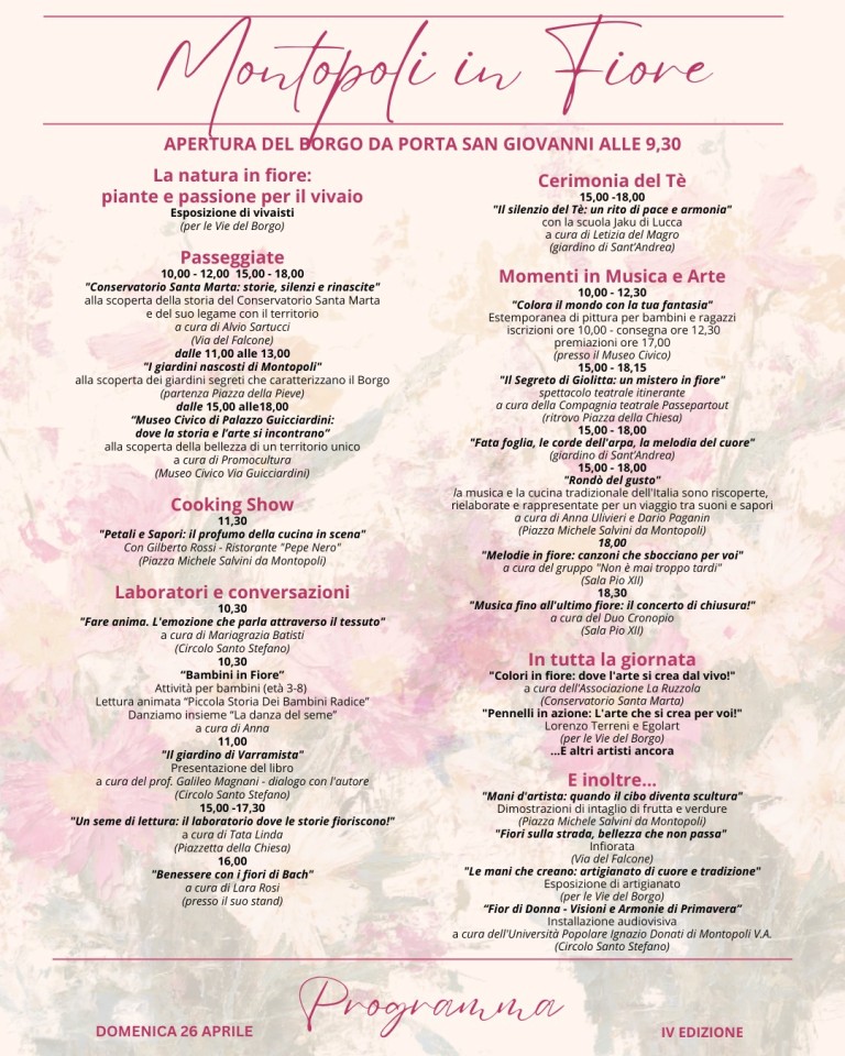Il programma prevede esposizioni di vivaisti e artigianato locale lungo le vie del borgo per tutta la giornata. Sarà possibile partecipare a visite guidate alla scoperta dei tesori nascosti, come il Conservatorio Santa Marta, i giardini segreti del borgo e le bellezze del Museo Civico di Palazzo Guicciardini. La mattinata si aprirà con incontri dedicati alla lavorazione dei tessuti e presentazioni di libri, come 'Il giardino di Varramista'. Alle ore 11.30, in piazza Michele da Montopoli, lo chef Gilberto Rossi del ristorante 'Pepe Nero' sarà protagonista del cooking show 'Petali e Sapori'. Nel pomeriggio, spazio al benessere con approfondimenti sui fiori di Bach e con la cerimonia del tè. Ci saranno poi performance itineranti come lo spettacolo teatrale 'Il Segreto di Giolitta' della compagnia teatrale Passepartout e le note dell'arpa di "Fata foglia". La giornata si concluderà in Sala Pio XII con i concerti "Melodie in fiore" e il brindisi musicale di chiusura del Duo Cronopio.