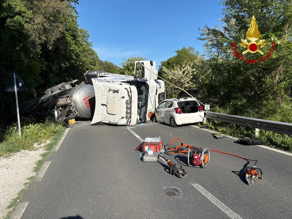 Si è verificato un grave incidente sulla Ss 68 a Montecatini Valdicecina. Il sinistro, avvenuto nel pomeriggio del 28 aprile, ha coinvolto un camion cisterna e diverse auto. Ci sarebbero tre feriti e la strada resterà chiusa per tutta la notte, visto che si è verificato uno sversamento di liquidi dalla cisterna. Un ferito sarebbe in grave condizioni. Presenti sul posto i soccorsi, tra cui Pegaso, i vigili del fuoco e le forze dell'ordine. In corso di accertamento le cause dell'incidente.