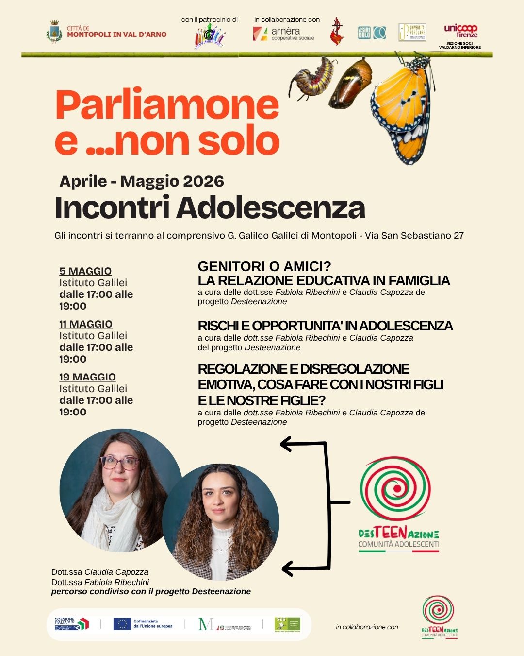 Dopo i primi appuntamenti dedicati all'infanzia, sta per cominciare il ciclo dedicato all'adolescenza, uno spazio di riflessione e supporto per genitori ed educatori. Tutti gli appuntamenti si terranno all’Istituto Comprensivo G. Galileo Galilei (Via San Sebastiano 27, Montopoli in Val d’Arno) dalle ore 17 alle 19 e saranno curati dalle Dott.sse Fabiola Ribechini e Claudia Capozza del progetto Desteenazione.